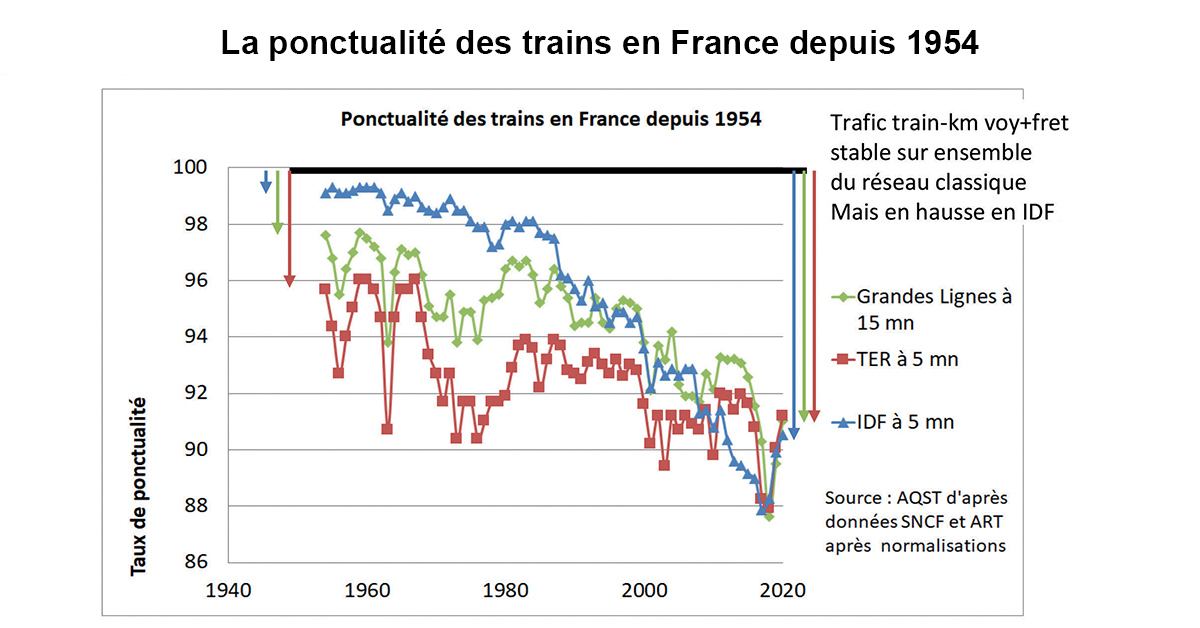 Ainsi, le nombre de trains considéré comme étant en retard a été multiplié par plus de 3 entre 1954 et nos jours. C’est particulièrement important en Ile-de-France où la multiplication est de 6, même s’il faut rappeler bien sûr que les intensités de circulations ont augmenté bien davantage dans cette région qu’ailleurs en France.