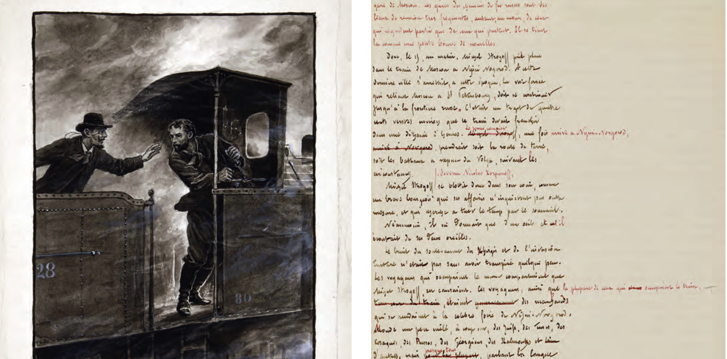 A gauche : Claudius Bombarnanc, Poul Steffensen, dessin pour une édition danoise, 1901. A droite : Michel Strogoff, manuscrit autographe de Jules Verne, 1875.